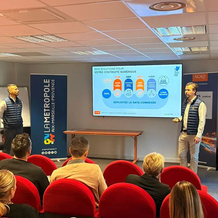 Abel Olivier (4CAD Group) a ouvert la session devant une quinzaine de jeunes entreprises de la région Aix-Marseille-Provence en rappelant le rôle central de la simulation : réduction des itérations physiques et optimisation de la conception, de la spécification à la validation.