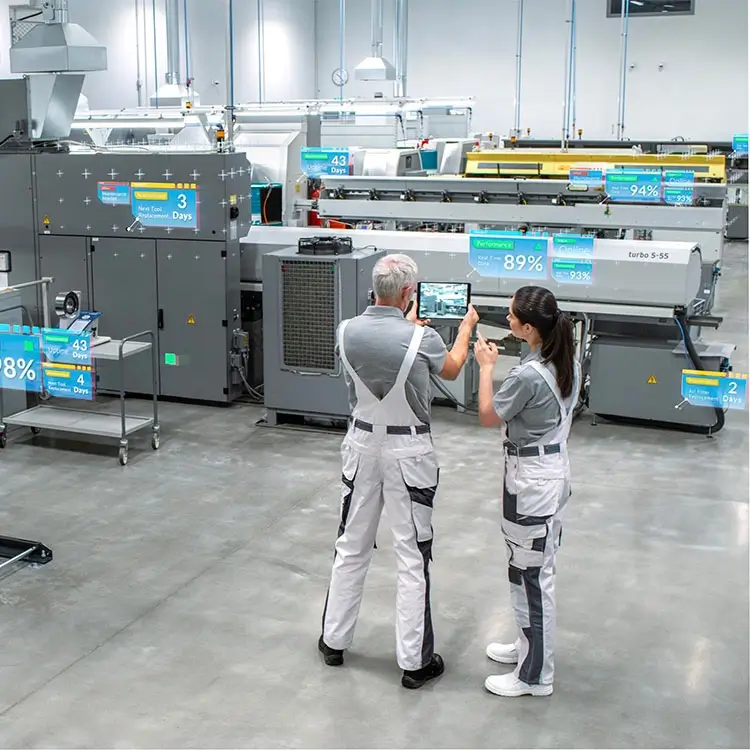 Couplée à vos données issues du terrain (produits connectés et moyens de production connectés), la solution Vuforia Studio ouvre la voie à une multitude de possibilités pour concevoir, monitorer, interagir avec vos produits et vos machines, ainsi que pour former vos techniciens et vos clients aux bonnes méthodes d'utilisation et d'entretien.